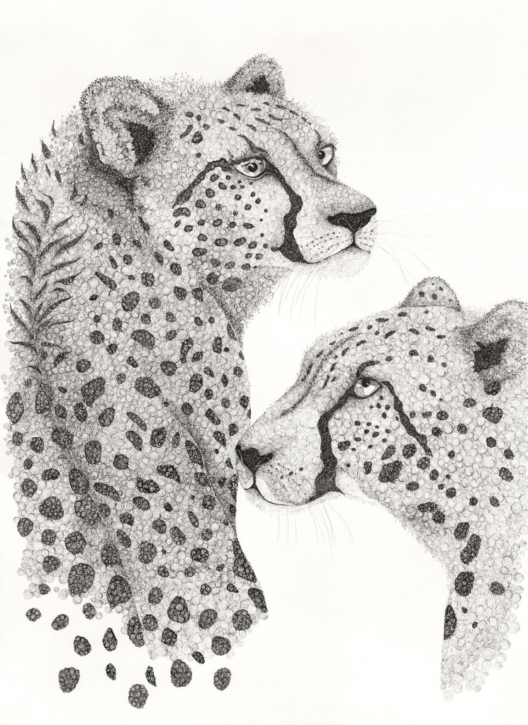 The spirals I drew on scrap sheets of paper captured me: I fell into them and their repetition…thousands of them connected to form a shape, to represent a life form – out of the multitude, an individual, the multitude of spirals connected to form a shape, a life form. And just like the spiral that starts out vast and closes in to a minute point that is how I rendered my animals. I draw the body, limbs and muscles making my way to the head and face and lastly filling in the eyes. At which point I could look my animal in the eyes, smile and say hello.